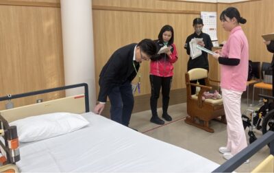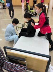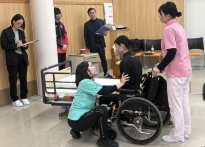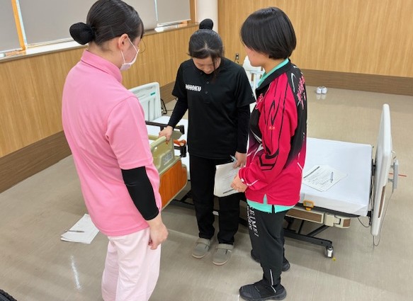 2日目には3校混合チームによる「ミックスマッチ」を実施。抽選で編成されたチームが、支援計画の検討から実技までを協働で行い、コミュニケーション力や介護過程の理解を深めた。教員による巡回指導も行われ、7分間(2人介護)の競技では、お互いの創意工夫を共有する学びの場となった。