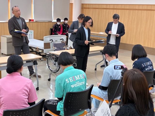 初日は食事介助、着脱介助、排せつ介助の3種目を実施。各校の代表生徒が1人介護で7分間の実技に臨んだ。評価は複数の福祉科教員が行い、競技後には全選手に対して具体的な助言が伝えられた。